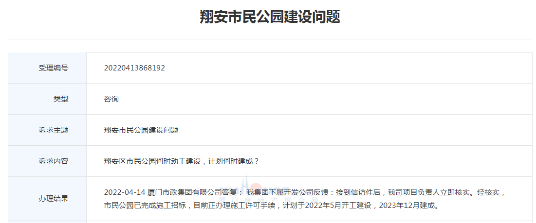對此,廈門市政集團有限公司答復:經(jīng)核實,市民公園已完成施工招標,目前正辦理施工許可手續(xù),計劃于2022年5月開工建設,2023年12月建成。