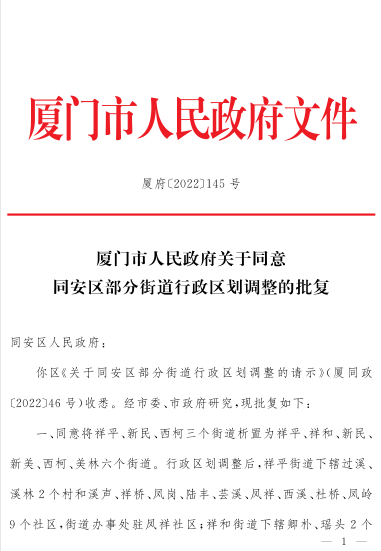 近日,廈門市人民政府發(fā)布關(guān)于同意同安區(qū)部分街道行政區(qū)劃調(diào)整的批復(fù)。