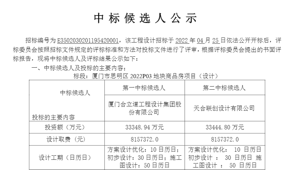 同時(shí),廈門市思明區(qū)湖濱一里2022P03地塊商品房項(xiàng)目(設(shè)計(jì))的招標(biāo)也在近期成功進(jìn)行。