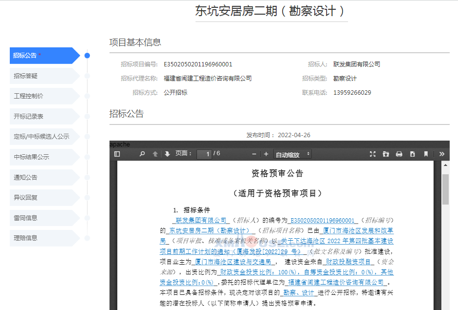 近日,東坑安居房二期(勘察設(shè)計(jì))招標(biāo)公告發(fā)布。