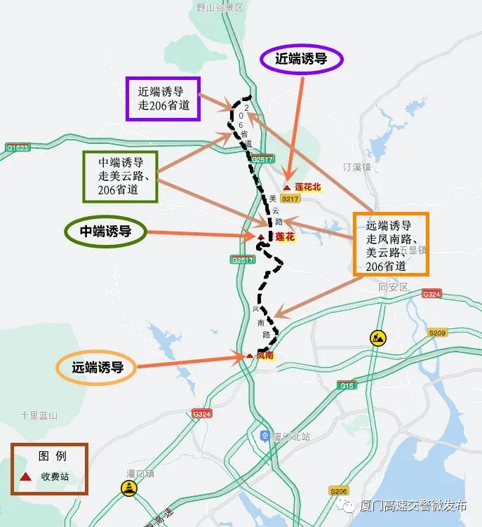 1、近端誘導(dǎo)——廈門往安溪方向車輛,可經(jīng)蓮花北收費站繞行206省道安溪方向行駛。