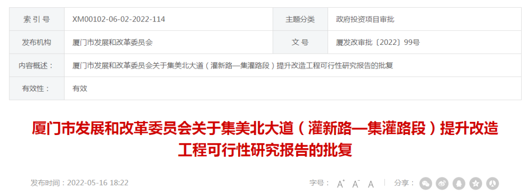 5月16日,廈門(mén)市發(fā)展和改革委員會(huì)發(fā)布了關(guān)于集美北大道(灌新路—集灌路段)提升改造工程可行性研究報(bào)告的批復(fù)。