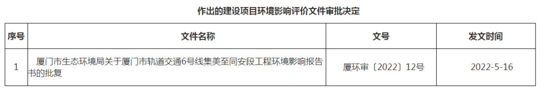 5月16日,廈門(mén)市生態(tài)環(huán)境局發(fā)布了關(guān)于廈門(mén)市軌道交通6號(hào)線(xiàn)集美至同安段工程環(huán)境影響報(bào)告書(shū)的批復(fù)文件。
