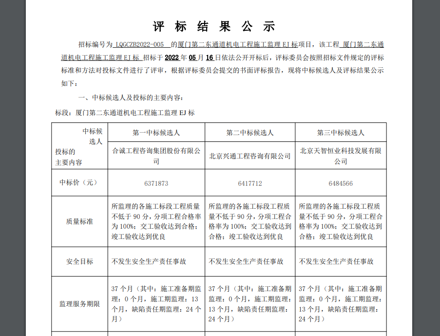 其一,廈門(mén)第二東通道機(jī)電工程施工監(jiān)理EJ標(biāo)公開(kāi)招標(biāo),評(píng)標(biāo)結(jié)果公示。