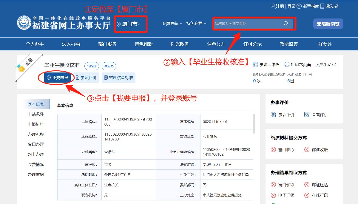 方式一:登錄“福建省網(wǎng)上辦事大廳廈門分廳” (http://xm.zwfw.fujian.gov.cn),將地址定位至【廈門市】,在搜索框內(nèi)輸入【畢業(yè)生接收核準(zhǔn)】,點(diǎn)擊【我要申報(bào)】并登錄即可在線辦理。