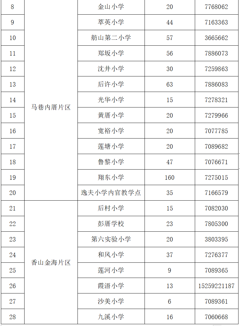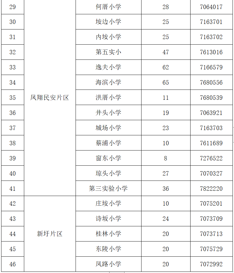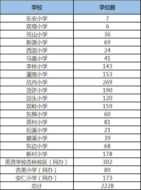 湖里區(qū)2022年積分入學(xué)公、民辦小學(xué)可提供電腦派位的學(xué)位數(shù)為2588個(gè),其中公辦學(xué)位690個(gè),民辦學(xué)位1898個(gè),具體各校學(xué)位情況見(jiàn)下表: