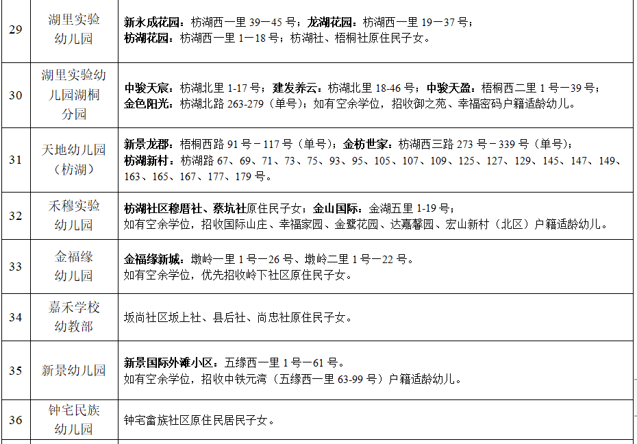 2.秀德幼兒園、高林南區(qū)幼兒園、高林南區(qū)東宅分園、馬垅陽光幼兒園、蔡塘幼兒園、后埔幼兒園、鐘宅民族幼兒園、后坑幼兒園、港務(wù)幼兒園、天地幼兒園(枋湖)、天地興隆幼兒園、華榮梅沙幼兒園、國貿(mào)殿前幼兒園、國貿(mào)優(yōu)才實驗幼兒園等14所幼兒園在確保完成片區(qū)招生任務(wù)且班生數(shù)有余額的情況下,可優(yōu)先招收片外本市戶籍的適齡幼兒,具體要求詳見各園招生通告。