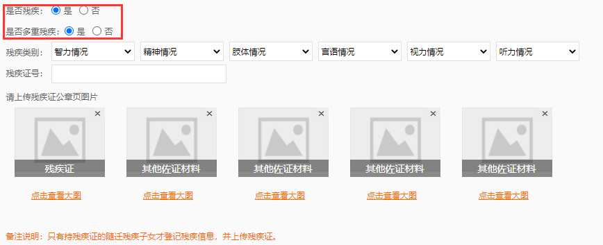 持有殘疾證的隨遷殘疾適齡子女需要在“是否殘疾”一欄選“是”,并選擇是否多重殘疾、填寫對(duì)應(yīng)殘疾類別、殘疾等級(jí)、填寫殘疾證號(hào)、上傳殘疾證公章頁(yè)照片。