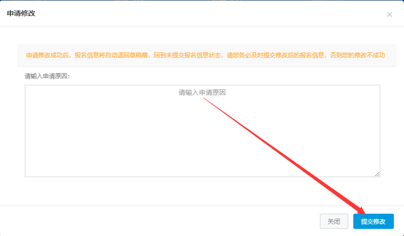 報(bào)名提交后,若填寫信息有誤,點(diǎn)擊“申請(qǐng)修改”,填寫原因后提交,待區(qū)教育局審核通過后,可對(duì)提交材料進(jìn)行修改,并重新提交。