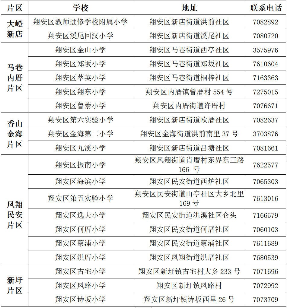 翔安區(qū)2022年秋季小學(xué)積分入學(xué)便民服務(wù)登記點一覽表