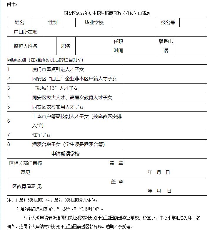 戶籍在同安一中招生片區(qū)的學(xué)生還應(yīng)繳交戶口簿復(fù)印件(落戶截止日期為2022年5月30日,學(xué)校核驗,原件復(fù)?。?。要求“捆綁派位”或不參加電腦派位的學(xué)生,其監(jiān)護人應(yīng)于規(guī)定時間向同安區(qū)教育局提出書面申請;要求照顧參加同安一中電腦派位的學(xué)生(即港澳臺、駐軍部隊子女)和要求照顧錄取的學(xué)生應(yīng)填寫《同安區(qū)2022年初中招生照顧錄取(派位)申請表》(附件2),附上相關(guān)證明材料送畢業(yè)學(xué)校,各中心小學(xué)、區(qū)直屬學(xué)校匯總后打印《名冊》,連同個人申請材料于規(guī)定時間送區(qū)教育局。