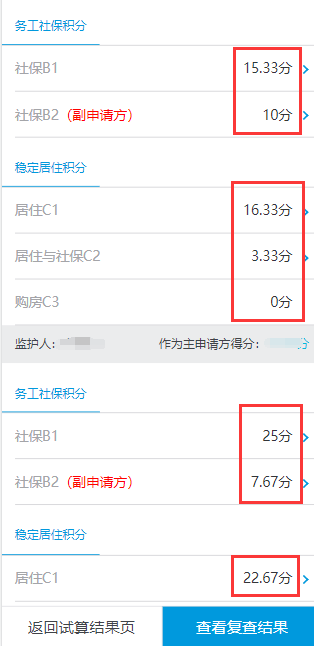 2、積分試算界面會(huì)顯示分別以兩個(gè)監(jiān)護(hù)人為主申請(qǐng)人的分?jǐn)?shù)。點(diǎn)擊右方“查看積分明細(xì)及復(fù)查”的可以查看積分得分明細(xì)。