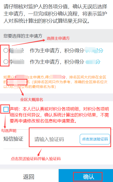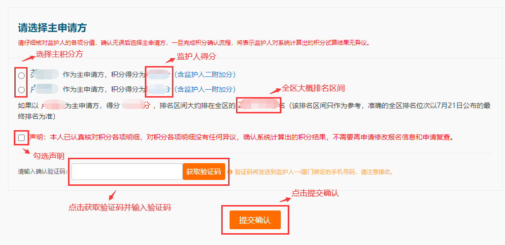 4、各項(xiàng)積分都確認(rèn)無(wú)誤后,選擇積分較高的監(jiān)護(hù)人作為主申請(qǐng)方,并在確認(rèn)聲明前的方格打鉤,獲取并輸入收到的驗(yàn)證碼,提交確認(rèn)。