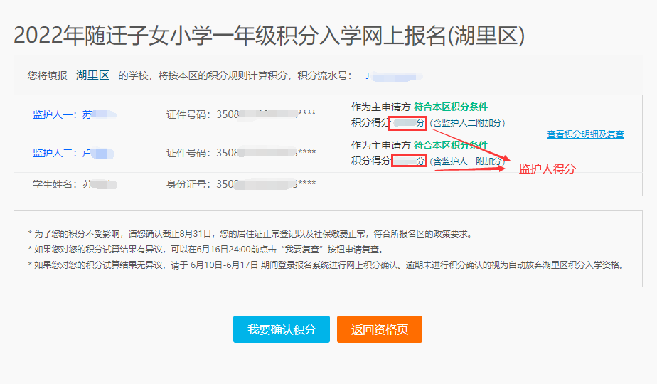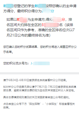 溫馨提示:積分確認(rèn)界面會(huì)顯示一個(gè)積分排名區(qū)間,這是系統(tǒng)默認(rèn)以每個(gè)申請(qǐng)人中積該排名所在區(qū)間僅供參考,準(zhǔn)確排名以7月21日公布的最終排名為準(zhǔn)。同時(shí)提醒,請(qǐng)排名靠后的申請(qǐng)人做好回戶籍地入學(xué)的準(zhǔn)備。
