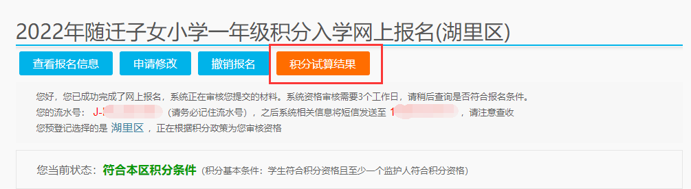 溫馨提示:如您電腦界面中“積分試算結(jié)果”按鈕為灰色無(wú)法點(diǎn)擊,則表示兩個(gè)監(jiān)護(hù)人都不符合湖里區(qū)積分入學(xué)的基本條件(具體哪項(xiàng)不符合可以查看系統(tǒng)界面中的資格審核表),不能參加湖里區(qū)積分入學(xué)電腦派位。請(qǐng)這部分隨遷子女家長(zhǎng)務(wù)必盡早聯(lián)系戶籍所在地學(xué)校就讀。