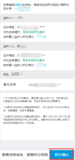 溫馨提醒: 積分確認(rèn)界面會(huì)顯示一個(gè)積分排名區(qū)間,這是系統(tǒng)默認(rèn)以每個(gè)申請(qǐng)人中積分較高的一方進(jìn)行的排名,該排名所在區(qū)間僅供參考,準(zhǔn)確排名以7月21日公布的最終排名為準(zhǔn)。同時(shí)提醒,請(qǐng)排名靠后的申請(qǐng)人做好回戶籍地入學(xué)的準(zhǔn)備。