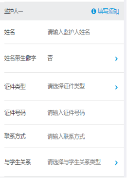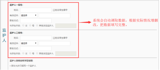 1.系統(tǒng)在家長(zhǎng)輸入完學(xué)生信息后,系統(tǒng)將自動(dòng)填寫(xiě)學(xué)生監(jiān)護(hù)人的部分信息,家長(zhǎng)自行將信息補(bǔ)充完整。