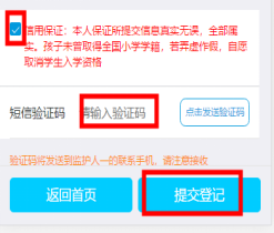 填寫(xiě)完上述所有信息,確認(rèn)所填信息準(zhǔn)確無(wú)誤后,請(qǐng)勾選“信用保證”。然后點(diǎn)擊發(fā)送驗(yàn)證碼,系統(tǒng)會(huì)將短信發(fā)送至監(jiān)護(hù)人一的手機(jī),收到短信后輸入驗(yàn)證碼,然后點(diǎn)擊下方的“提交登記”完成本次預(yù)約登記。