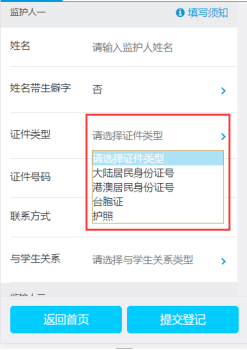 3.港澳臺(tái)外的監(jiān)護(hù)人信息無(wú)法自動(dòng)填寫(xiě),需要家長(zhǎng)自行填寫(xiě)完整。監(jiān)護(hù)人為港澳居民的選擇填寫(xiě)“港澳居民身份證號(hào)”,監(jiān)護(hù)人為臺(tái)灣居民的選擇填寫(xiě)“臺(tái)胞證”號(hào),監(jiān)護(hù)人為外籍的選擇填寫(xiě)“護(hù)照”號(hào)。