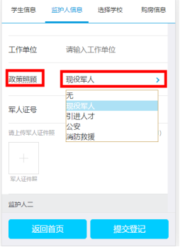 4.現(xiàn)役軍人、引進(jìn)人才、公安、消防政策照顧人員,需要家長(zhǎng)自行選擇對(duì)應(yīng)類(lèi)型,填寫(xiě)對(duì)應(yīng)證號(hào)。