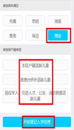 選擇“區(qū)屬校戶籍小學(xué)報(bào)名”進(jìn)入各區(qū)網(wǎng)上預(yù)約登記界面,選擇翔安區(qū),然后根據(jù)自身情況選擇本區(qū)戶籍或者港澳臺(tái)外籍進(jìn)入相應(yīng)預(yù)約界面。