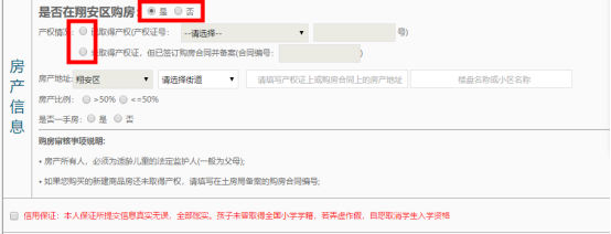 2.請(qǐng)根據(jù)自己的房產(chǎn)情況認(rèn)真填寫(xiě)相對(duì)應(yīng)的房產(chǎn)信息。房產(chǎn)所有人必須為適齡兒童的法定監(jiān)護(hù)人(一般為父母),如果您購(gòu)買(mǎi)的新建商品房還未取得產(chǎn)權(quán)證,請(qǐng)?zhí)顚?xiě)在土房局備案的購(gòu)房合同編號(hào)。