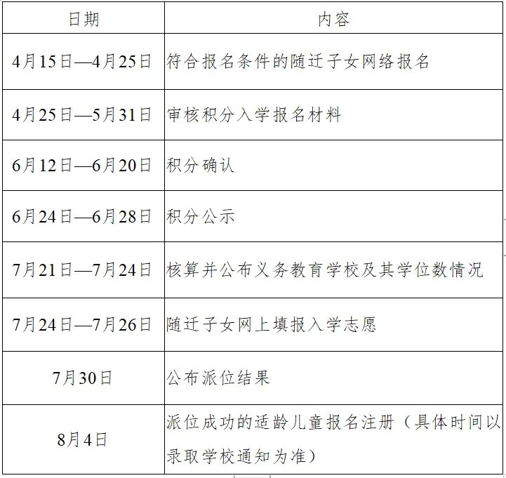積分入學(xué)工作日程安排表