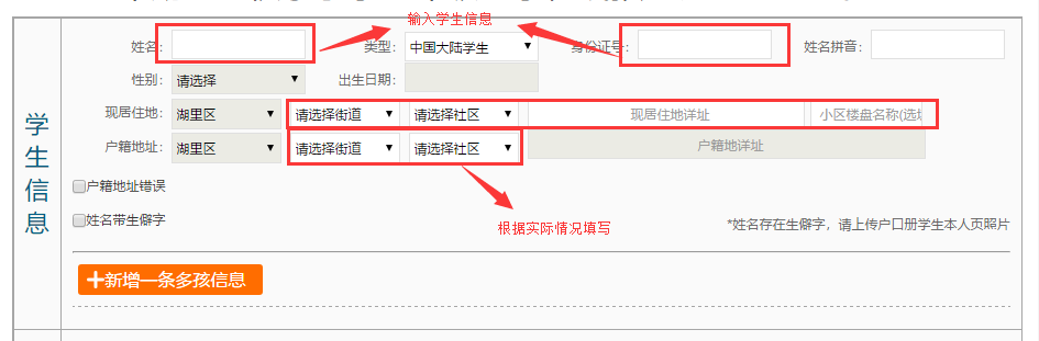 ?如果學(xué)生姓名帶生僻字,需勾選“姓名帶生僻字”,然后上傳戶口本學(xué)生本人頁圖片。若孩子的戶籍在湖里區(qū)內(nèi)發(fā)生遷移,網(wǎng)絡(luò)登記時(shí)仍顯示的是舊地址,可勾選戶籍地址有誤并填寫正確地址。