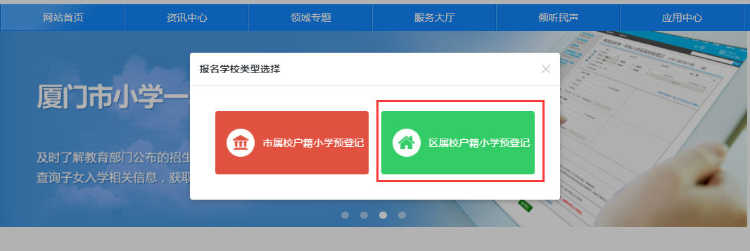4、進(jìn)入?yún)^(qū)屬校戶籍小學(xué)預(yù)登記頁面選擇“戶籍小學(xué)預(yù)登記”-“區(qū)屬校戶籍小學(xué)預(yù)登記”進(jìn)入。