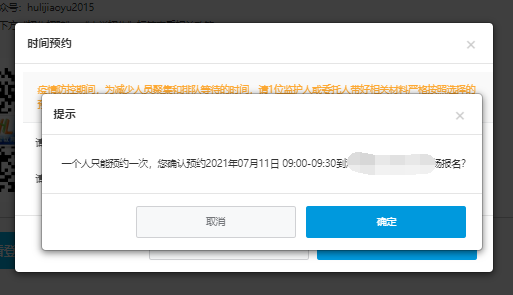 選擇預(yù)約日期及預(yù)約時(shí)間段,一個(gè)人只能預(yù)約一次,請考慮清楚后再確認(rèn)提交預(yù)約時(shí)間。