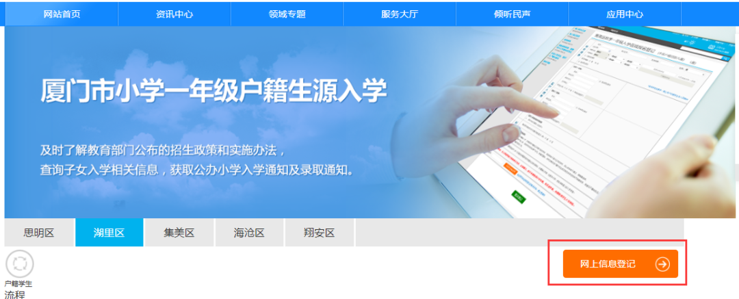 5、進(jìn)入預(yù)約登記頁面選擇“湖里區(qū)”,點(diǎn)擊“網(wǎng)上信息登記”進(jìn)入預(yù)約登記頁面。