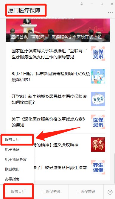 1.關(guān)注“廈門市醫(yī)療保障”微信公眾號(hào),點(diǎn)擊菜單欄中的“服務(wù)大廳”,選擇“服務(wù)大廳”;