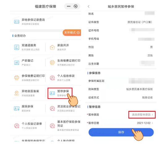 2.在業(yè)務(wù)經(jīng)辦欄目點(diǎn)擊【暫停參保】進(jìn)入。仔細(xì)核對(duì)個(gè)人信息,選擇暫停原因,點(diǎn)擊【保存】完成申請(qǐng)。